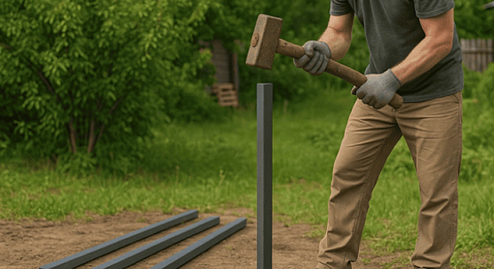 Столбы забивают по уровню строго вертикально на расстоянии 2,5 - 3 метра друг от друга.